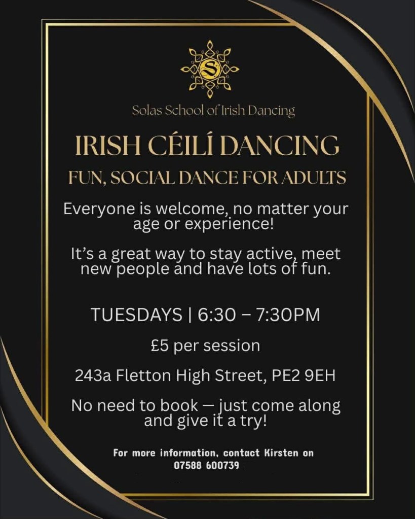 We hold adult céilí classes on Tuesdays from 6:30-7:30pm in Fletton for ages 18+. No experience is necessary and there is no upper age limit, just come along and give it a try!